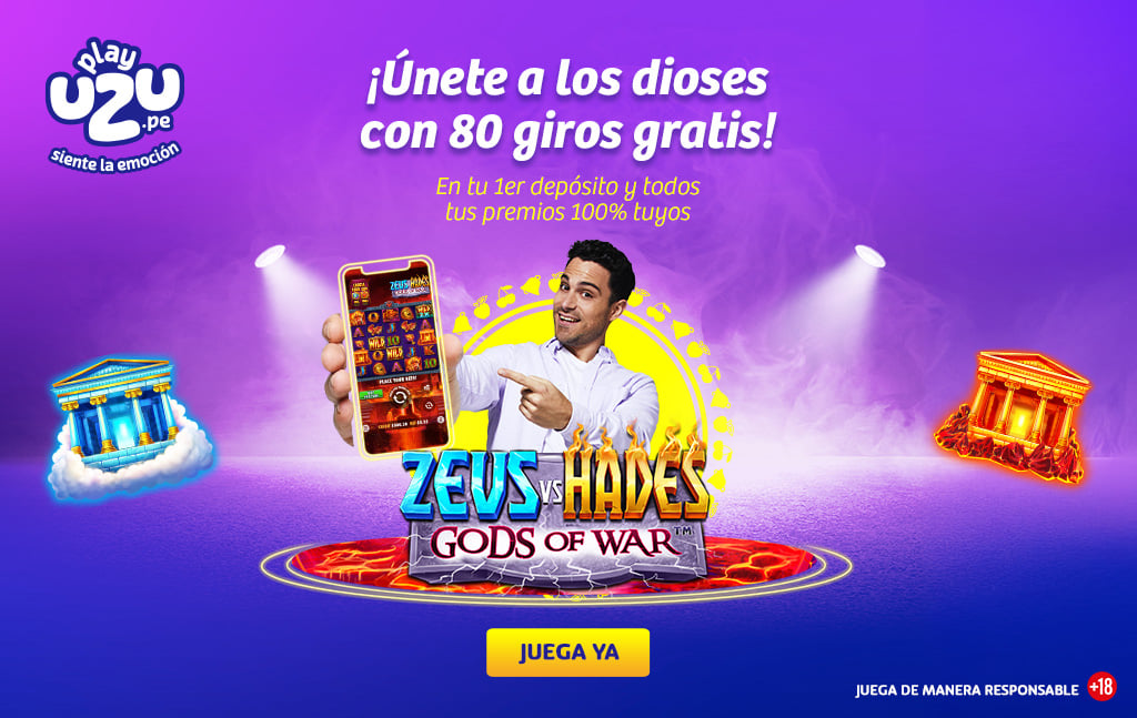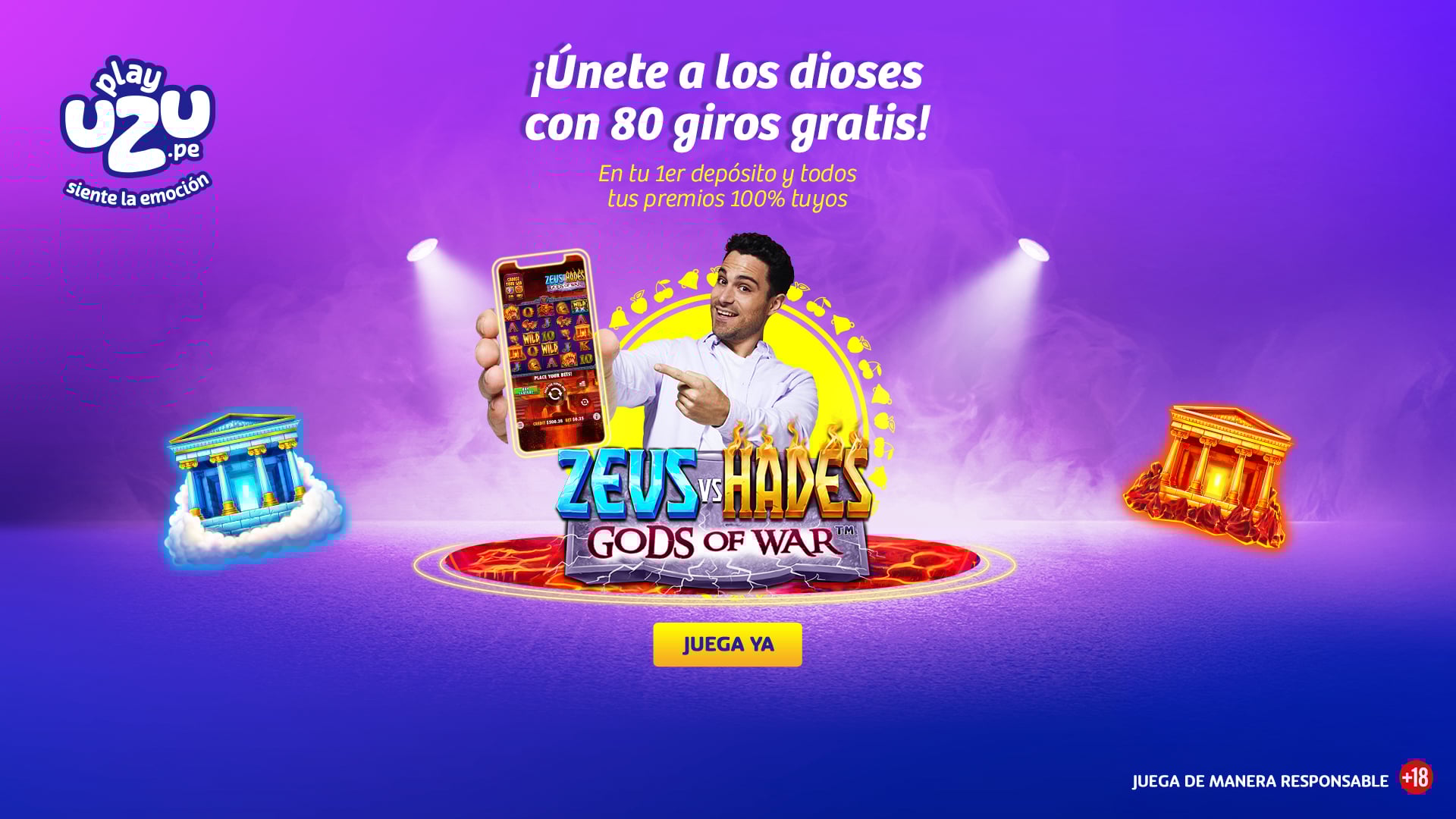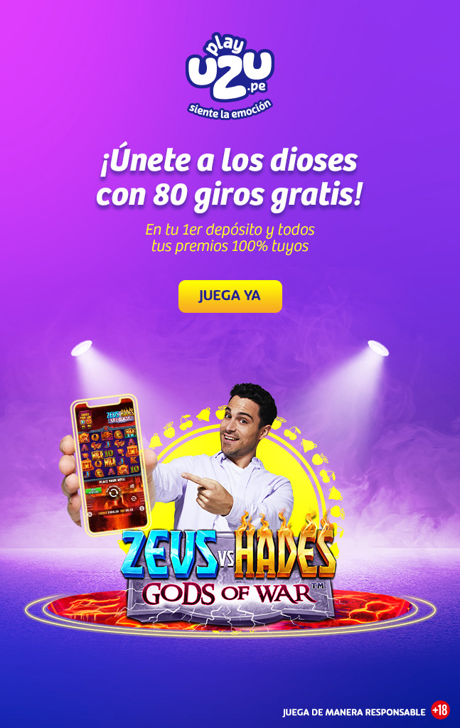 Esta oferta sólo está disponible para quienes depositan por primera vez. Depósito mínimo: S/ 40. 50 Giros Gratis en Zeus vs Hade de cada giro: S/ 0.30. Después de depositar, reclama tus 30 Giros Gratis extra en la sección Sorpresas. Sin límite mín. de retiro. Esta oferta no se puede combinar con ninguna otra. Esta oferta sólo está disponible para jugadores específicos, seleccionados por PlayUZU. Si no usaste tu enlace de invitación de PlayUZU para llegar a esta página, no eres elegible a esta oferta. El juego irregular podría resultar en la pérdida de tus recompensas. El juego irregular podría resultar en la pérdida de tus recompensas. Aplican las políticas de Recompensas y Juego de UZU. Más información.